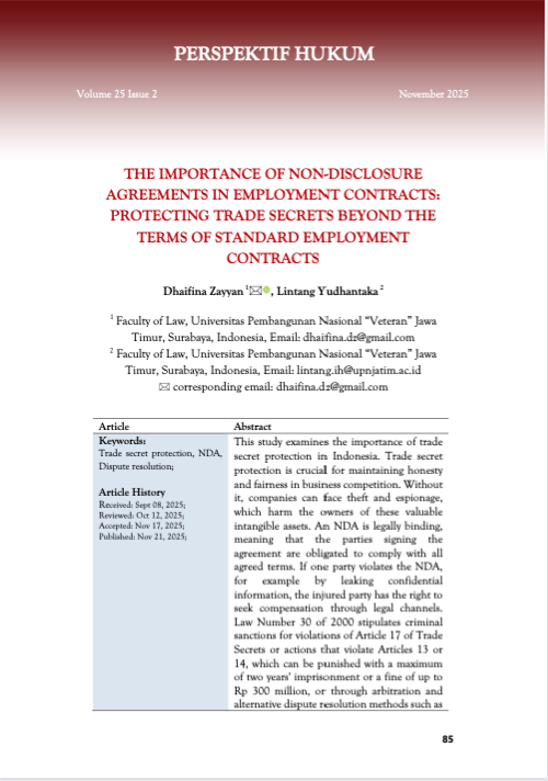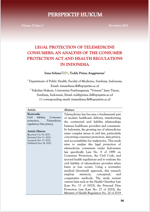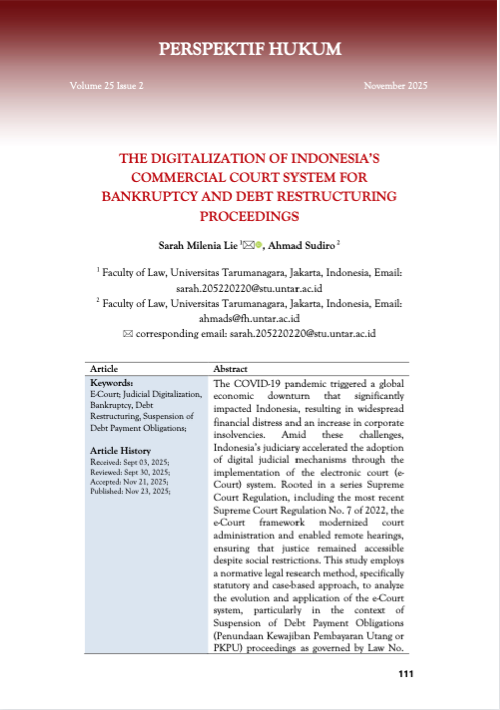 Perspektif Hukum P-ISSN 1411-9536 dan E-ISSN 2460-3406 is an open access peer-reviewed law journal affiliated with the Faculty of Law, Hang Tuah University and Published by Hang Tuah University, in print version in 2001. The purpose of this Journal is to be a medium for legal scholars and practitioners to contribute their ideas resulting from legal research as well as conceptual articles to be disseminated to the public for the development of Indonesian law. It is published twice a year in May and November. The scope of the articles concerns legal issues concerning  Criminal Law, Private Law, Constitutional Law, Administratuve Law, Environmental Law, Digitalization and the Transformation of Law, The Influence of AI in the Law and Judicial System.